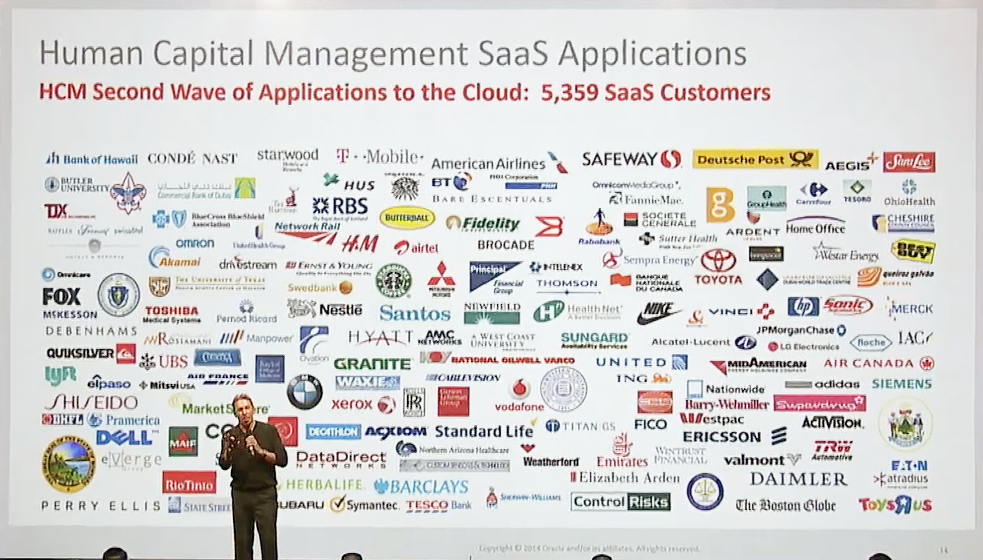 He says that 2014 is an inflection point for Oracle in terms of selling these solutions. The fact that 19 out of the top 20 SaaS providers use the Oracle Database and Java is obviously something that Larry would enjoy (and the lone company that doesn’t – Workday – uses another Oracle Database – MySQL – for some of its back-end processing).
