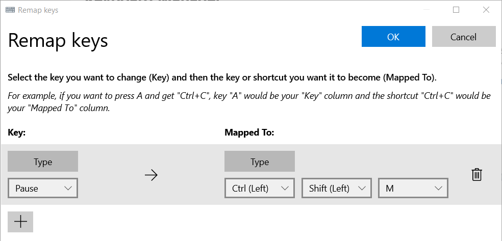 A quick google shows there are a number of ways to remap keys on your keyboard. There are many free tools (see a list here) however I opted for one which isn’t on that list. Microsoft PowerToys is a free set of utilities from Microsoft intended to make Windows 10 better. One of the utilities it contains is ‘Keyboard Manager’. Here’s what it looks like: