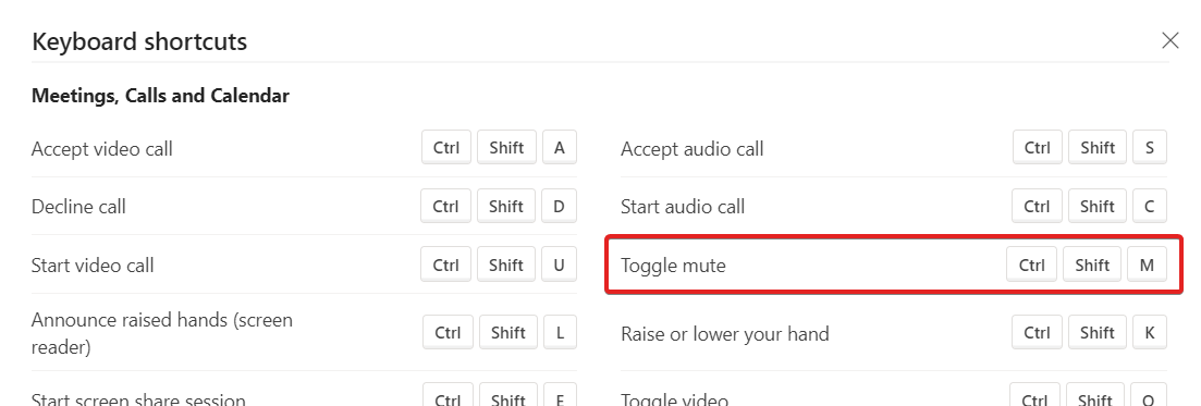 What shortcut keys are available in Teams? There’s no ‘push to talk’ key, but there is a ‘toggle mute’ which is almost as good. Unfortunately it’s not a particularly user-friendly key combination = Ctrl + Shift + M. A lot of people are going to need to glance down at the keyboard for that one and the opportunity to add to the conversation may have passed.