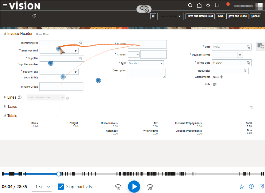 Here you can see the playback of a recorded session with progress bar at the bottom for quick navigation, and the cursor path and mouse clicks highlighted on the screen.