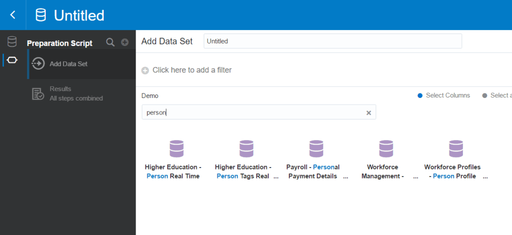 Next you build your Data Set. It gives you all of the subject areas in OTBI plus all of the Analytics you’ve built to choose from. It also looks like it lets you enter Logical SQL (although I didn’t try this). It doesn’t appear you can enter raw SQL against the database (yet) however.