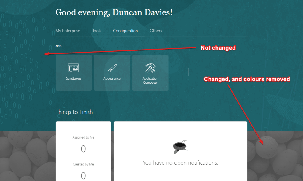 To me it had the feel of a theme that has been designed for Oracle to do attractive demos and isn’t quite so geared to customer pods – at least not yet.