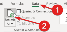 Now view the Dashboard tab. On the Excel ribbon at the top select Data, then Refresh All: