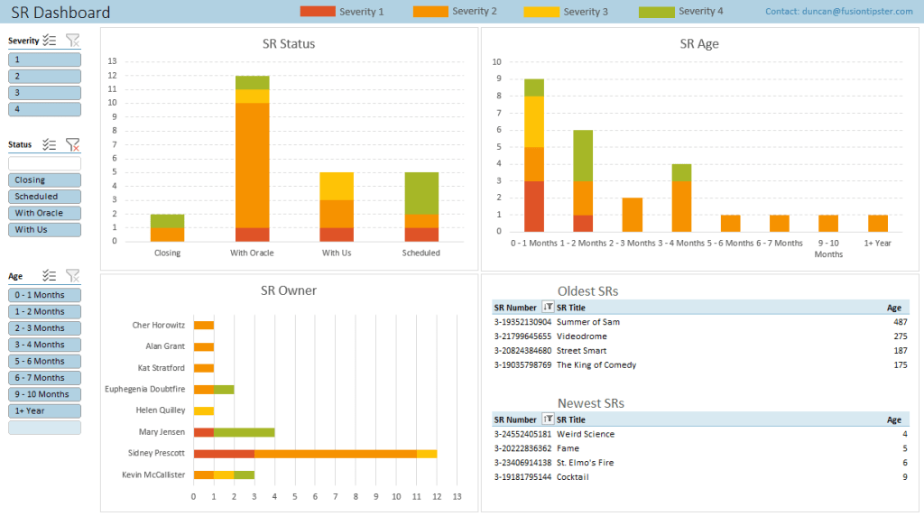 Your SR data will now be summarised and displayed nicely. Clockwise from top left the charts show (1) SR Status – the count of SRs by the SR status, (2) SR Age – the count of SRs within each age bracket, (3) the oldest and newest SRs, and (4) SR Owner – who in your team has the most open SRs. Additionally, all the data in the charts is colour-coded by severity so you can see the status of your most critical SRs.