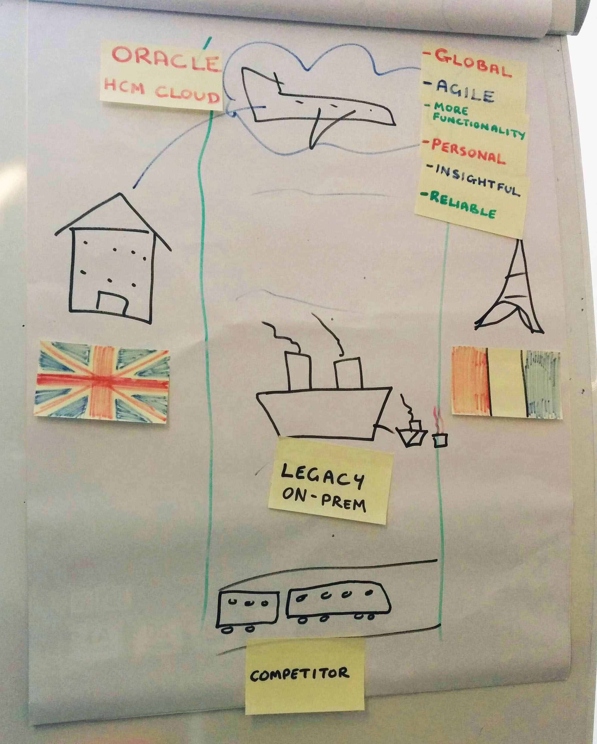 c) Choose the Oracle HCM Cloud (draw cloud and plane). This is obviously analogous to flying which is the quickest route (although technically I guess this depends upon where you start!). It also unleashes your company’s growth in a number of ways (adding post-its as we discuss them):